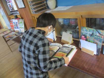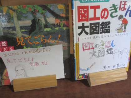 図書委員会では、にじプロ3「作品展」に向けて、職員室前でアートの本を紹介しています。また、読んだ本の感想をふせんに書いて貼るコーナーもあります。作品作りの参考やアートの世界への興味につながれば嬉しいですね。