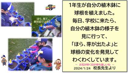 今日は雪が降る寒い日ですが、春になったら色とりどりの花が咲くことを楽しみに、1年生が自分の植木鉢に植えた球根の様子を観察しています。