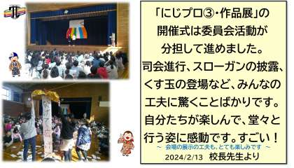 明日からの「にじプロ3〜作品展〜」を前に、9日(金)に開催式を行いました。体調不良でお休みをした友達の役割を引き受けて司会進行をする素敵な姿がありました。