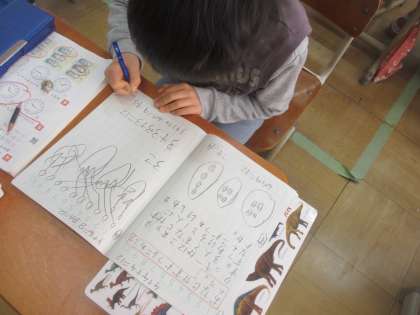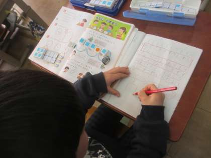 「おなじかずずつ」の学習は、2年生で習う「九九」につながります。図を書いたり、数図ブロックを使ったりしながら、1人に何個ずつ分けられるか、同じ数ずつ分けると何人に分けられるか考えています。板書を写すだけのノートでなく、自分の考えを書くことも慣れてきています。