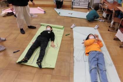 等身大の型取りを行い、1年間の成長を感じるとともに、今年できたことや頑張ったことを発表しました。