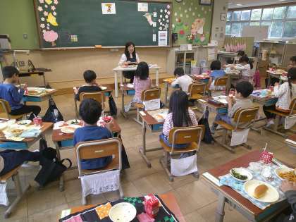 今日は小学生になって最初の給食を食べました。メインメニューはスパゲティー。ほかほかの給食をみんなで楽しくいただきました。おかわりでおなかがふくれすぎた人もたくさんいましたよ。明日の給食も楽しみですね。