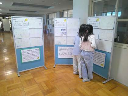理科室の前には、生活と結び付けて予想したり、実験結果を表や図にまとめたりして分かりやすく書いたものが掲示されています。自分のノートの取り方の参考にしようと見にくる子もいます。