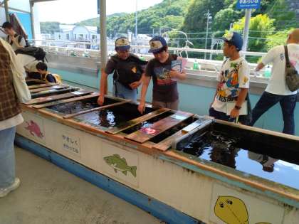 鳥羽水族館につきました。いろいろな海や川の生き物を、グループで声をかけ合って仲良く観察しています。