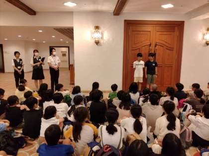 ホテルに到着しました。入館式では、代表の児童の言葉に続き、みんなでしっかりとあいさつをしました。ホテルスタッフのみなさま、2日間お世話になります。