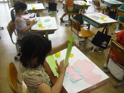 やぶいた紙の形から、どんな形や様子が浮かんでうかんでくるかを考えました。「キリンが散歩している!」「魚が泳いでいる!」と想像力豊かに、楽しみながら作品づくりをしています。