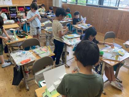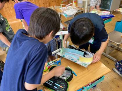 楽しくビー玉が転がるコースを作っています。坂道、障害物、得点などいろいろな仕組みを考えています。途中で転がしてみたり、友達に見せたりしながら試行錯誤している様子が見られます。