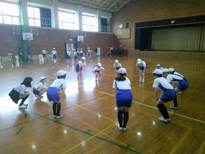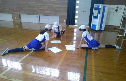 体育科の学習の前には,「体ほぐし」に取り組んでいます。手軽な運動を行い、体を動かす楽しさや心地よさを味わっています。自分自身の体の状態に気付くだけでなく、仲間の体の状態に気付き豊かに関わり合っています。