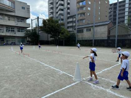 今日は、運動場で折り返しリレーの練習をしました。コーンを回ったり、ハードルを跳び越えたりしながら、バトンをつないでいきます。来週からは、自分たちで走順を話し合って決めていきます。