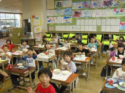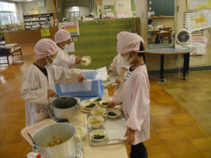 4時間目になると、「おなかすいた…」とつぶやき始める子どもたち。いつも、給食を楽しみにしています!今日は、子どもたちの大好きな、カレー味の肉じゃがでした。ほうれんそうとじゃこの炒め物もとてもおいしく、食が進みます。1年生の子どもたちも入学当時に比べると、たくさん食べられるようになりました。配膳もとても上手です!