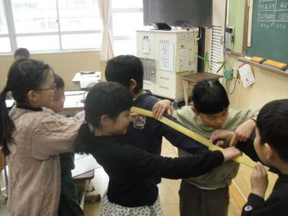 算数科の学習で、両手を広げた長さを予想して測ってみました。100cmを超える長さをどうしたら測れるのか、友達と話し合いながら工夫して測っていました。30cmものさしを直接あてる測り方では、正確には測れないということが分かり、明日は紙テープを使って測ってみようということになりました。「どのぐらいの長さなんやろう…」と明日の活動を楽しみにしている様子でした。