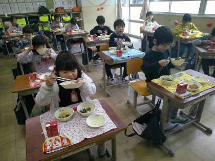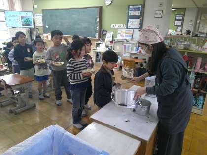 配膳もみんなで協力して時間内に行うことができます。おかわりをする子もいます。みんなで食べるとおいしくて、思わず笑顔になります。