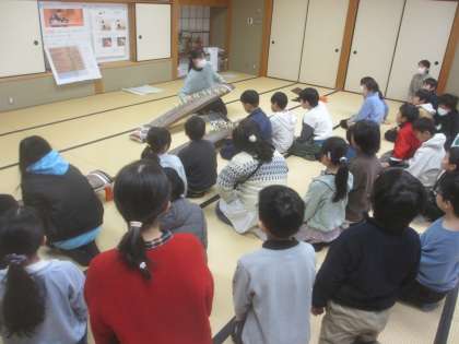 お箏の先生をゲストティーチャーに招き、「こと」に触れ、演奏をする体験をしました。楽器の名称について知った後、「さくらさくら」の曲を練習しました。漢字で書かれた楽譜のため、「七七八〜♪」と口ずさみながら演奏しました。「結構強い力で弾くんやなぁ」「難しいけど楽しく演奏できた!」と初めての体験を楽しむ姿が見られました。