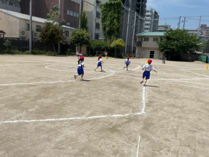 今日、1年生は運動場でかけっこあそびをしました。様々なコースを用いて、たくさん運動をしました。まっすぐコース、ぐるぐるコース、ジグザグコース、そしてコーンにタッチしながら走るにんじゃコース、子どもたちは4つのコースの中からお気に入りのコースを見つけ、楽しそうに走っていました。様々な走り方や動き方が、これからリレーやフィールドゲームにつながっていきます。