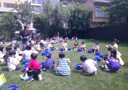 毎朝お水やりをしているアサガオから芽が出ました。うれしくてみんなで見合いっこをしました。よく見るとハート形をした葉っぱが2枚ついていました。これからもっともっと大ききなるのかな?今日の様子を観察カードにかきました。