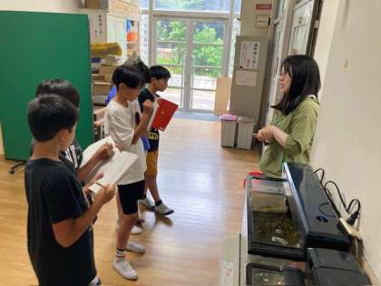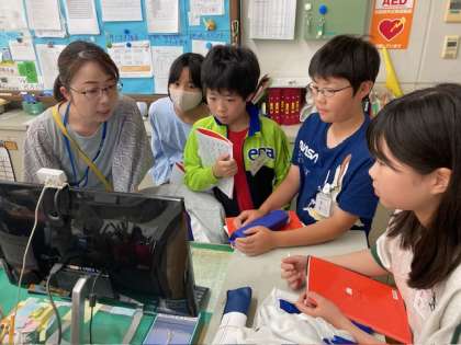 学校のよさについて考えた自分の考えを深めるため、教職員の方々にインタビューをしています。自分たちの聞きたいことだけでなく、相手の思いや考えを引き出すようにも気を付けています。
