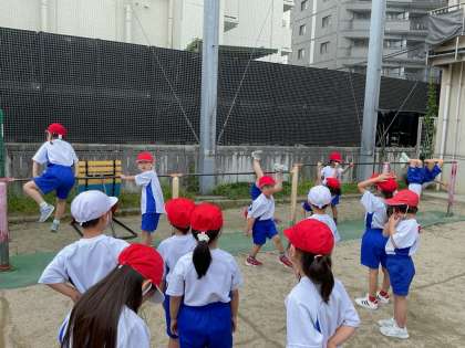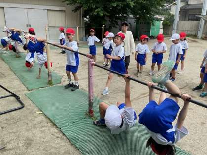 よく晴れた今日、1年生はてつぼうあそびに取り組みました。「あがる」「ささえる」「ぶらさがる」「ふる」「まわる」「おりる」と、6つの視点に技を分けて、自分でできる技、できるようになりたい技を考えながら取り組んでいます。「今日は〇〇ができるようになった!」「つぎはれんぞくにちょうせんする!」と、一生懸命練習しています。友達からアドバイスをもらったり、バランスのとり方を工夫してみたりする姿がたくさん見られました。