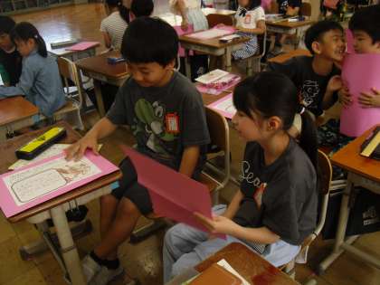 昔話や神話に親しみながら、おすすめしたい本の紹介カードを作りました。作ったカードを友達と見せ合いながら、おすすめの理由を伝えることができました。