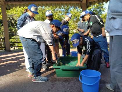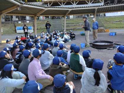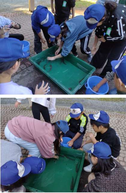 午前中の活動は、魚つかみです。生きの良いいわなをつかまえます。つるっとして掴みにくいけれど、一人一匹つかまえました。