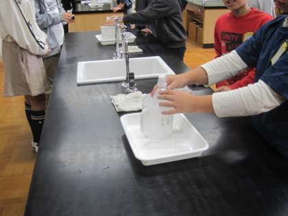理科の学習で理科室を使い始めました。「ものの温度と体積」の学習でスポンジロケットから不思議なことやもっと調べたいことを考えました。安全に実験できるように理科室の正しい使い方を確認しながら進めることができました。