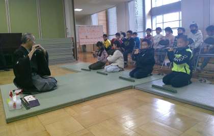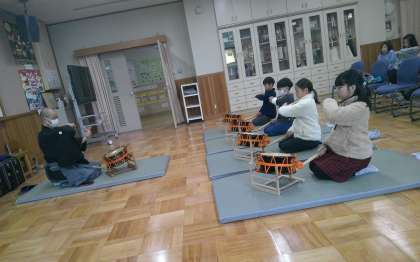 観世能を鑑賞した後に、5年生は、楽器の演奏体験をしました。楽器の種類は、「笛・太鼓・小鼓・大鼓」です。演奏の仕方を教えていただき、それぞれの楽器に挑戦しました。