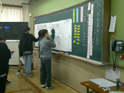 6年の国語科「鳥獣戯画を読む」の学習で、なぜ筆者の文章は、分かりやすく作品の魅力が伝わってくるのかを解決するために、文章にある工夫を見つけ、その効果について考えました。表現の工夫や絵の示し方、論の進め方などの視点をもとに読み深め、互いに見つけた工夫とその効果について交流することができていました。