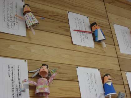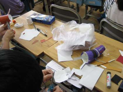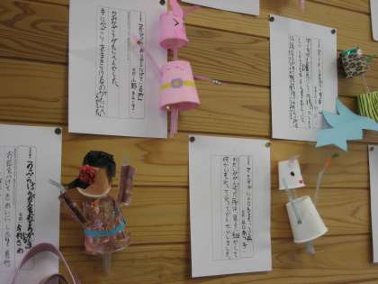 3本のストローと紙コップ使って動く人形を作っています。折り紙や小物を張り付けたり、毛糸をを髪の毛に見立てて張り付けたりして頑張って作っています。完成が楽しみです。