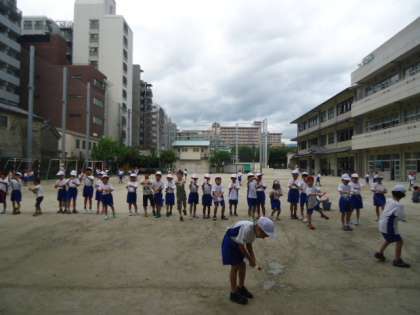 運動場では,ケチャップやマヨネーズなどの容器に水を入れ,水鉄砲にし,飛ばすなど夏の遊びを楽しむことができました。思い切り遊びが楽しめ,夏が好きになった子どもたちです。