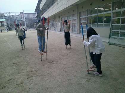 寒さに負けず子どもたちは元気いっぱいです。休み時間には,友達と一緒に竹馬をしたり大縄跳びをしたりして楽しく過ごしています。