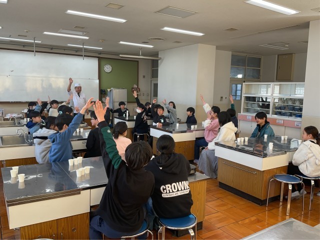 京料理のお店からゲストティーチャーを招き、「だしの授業」を行いました。子ども達は普段の生活ではなかなか意識しないだしについて、香りをかいだり、色の違いを比べたり、味を比べたりして興味津々な様子で授業に参加していました。