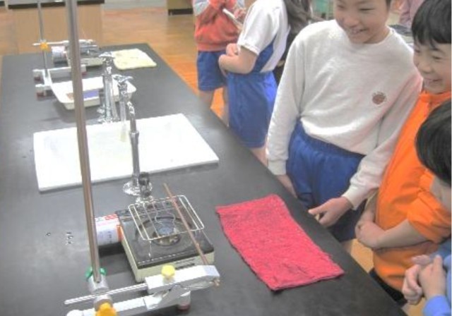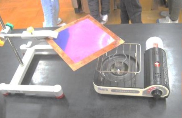4年生は理科で、温度とものの変化について学習をしています。今日はサーモインクを塗った金属を熱して、熱が順に伝わる様子を見る実験をしました。インクが青からピンクにはっきりと変わり、温度変化の様子をしっかりとらえることができました。