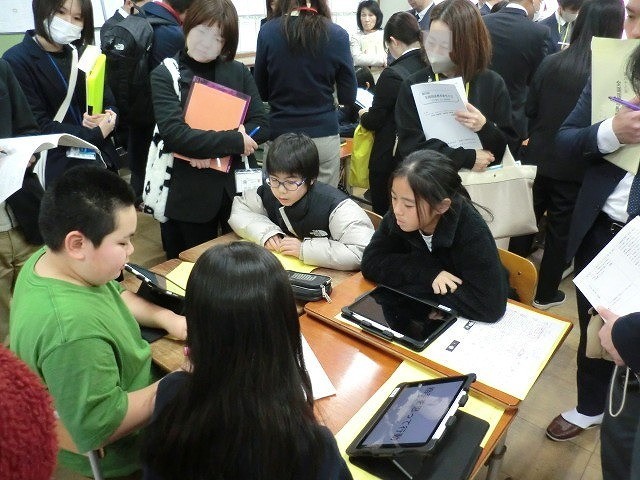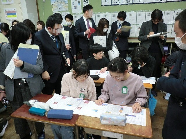たくさんの参観者に囲まれ、子どもたちは初め緊張した様子でしたが、めあてに向かって文章を読み深めたり、自分の経験と結び付けて意見を交流したり、主体的に学ぶ姿が見られました。