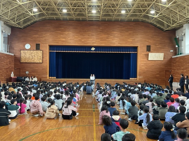 全校児童の前で話しました。
