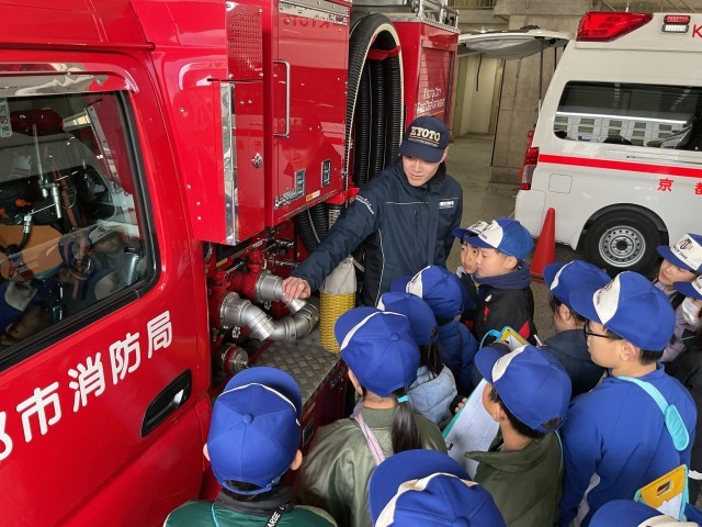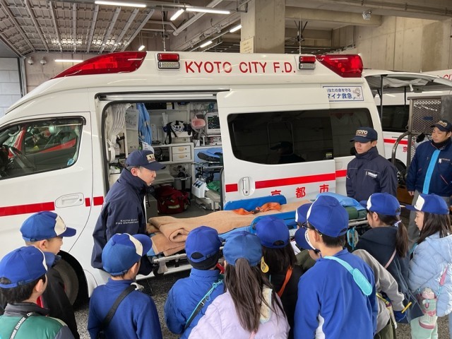 消防隊の方からは、消防車に載せている物の説明や、防火服を間近で見せてもらうなどしました。また、消防車と救急車の中にも乗らせてもらいました。地域のみんなの安全を守るために日々訓練を積んでいることがよくわかりました。