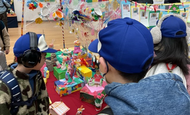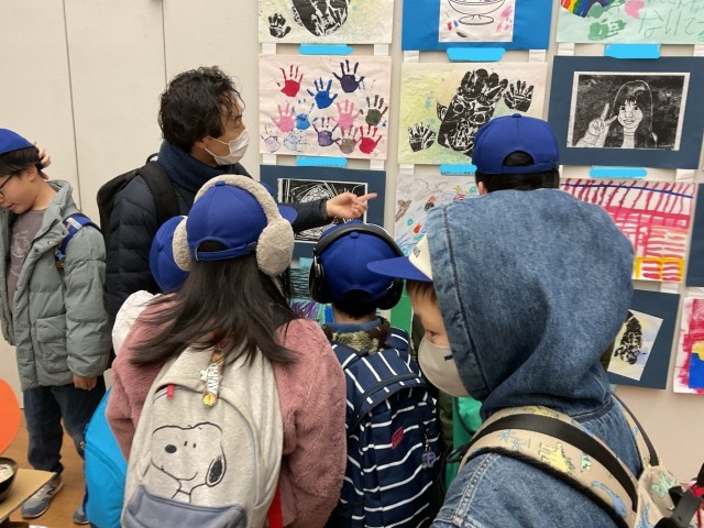 小さな巨匠展では、自分の作品を見つけると「あった!」と嬉しそうな表情を見せていました。また、他校の友達の作品の中で気になる作品があると、「見て、これすごい。〇〇みたい。」と、お気に入りの作品やポイントを周囲の友達や指導者に伝えていました。