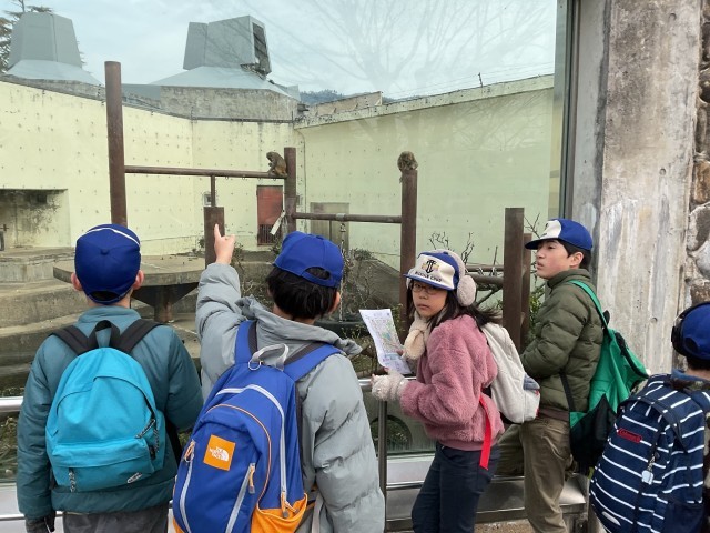 京都市動物園では、3つのグループに分かれて動物の観察をしました。見に行く動物や見て回る順番は、各グループごとに自分たちで決めました。また、グループによってはリーダーが時計を持ち、自分たちで集合時間を意識しながら行動しました。「あと15分だよ」「そろそろ戻ろうか」など声をかけ合う姿が見られ、時間を意識した行動をとることができていました。