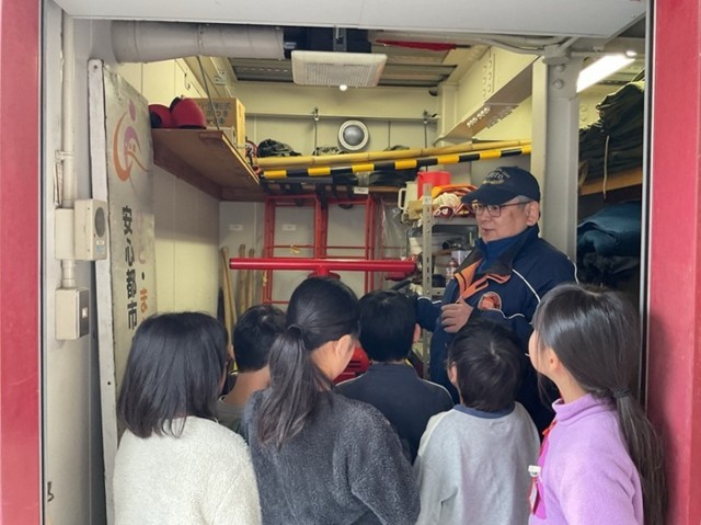 また、桃薗消防分団の倉庫も見せてもらいました。災害時の救助に使われるグッズがたくさんあり、