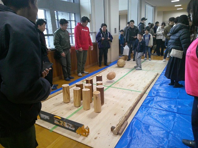 また、きこり特製丸太ボーリングもあり、重たい木の大玉を転がして楽しく遊ぶことができました。