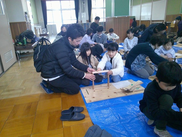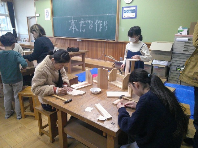 大工さんと一緒かわいいイスづくりを体験したり、材木屋さんと杉の本立てを作ったりしました。