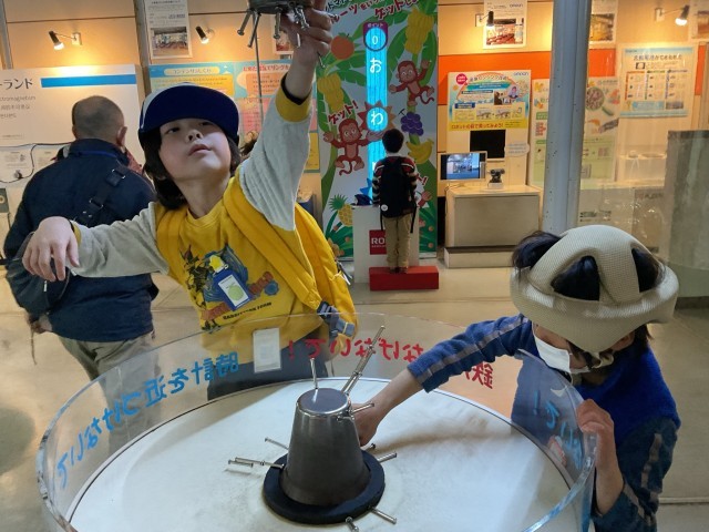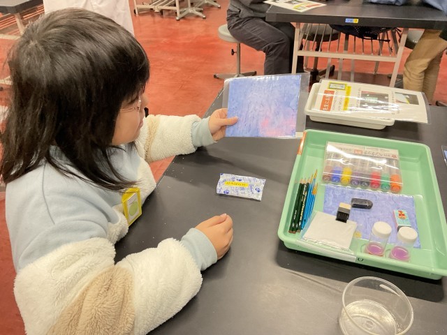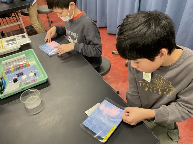プラネタリウムでは満天の星空が広がり、昔の人が星座を見つけ出したことに「すごい」と感心する姿がみられました。展示ブースでは、体を動かしながら実験装置に触れ、科学の不思議を楽しみながら学ぶ子どもたちの笑顔が印象的でした。高学年は「サーモインクシート」を使った実験に参加し、温度の変化によって色が変わる様子を観察しました。実際に色が変わる瞬間には、「変わった!すごい!」と歓声があがり、科学への興味がさらに深まった様子でした。体験を通して学びを広げる、充実した時間となりました。
