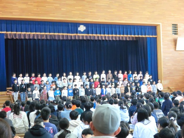 生活科の学習で行ったまちたんけんでの学びをもとに、クイズなどをつくって発表しました。校区の身近なところにあるお店の秘密がいっぱいわかり、全校で盛り上がりました。