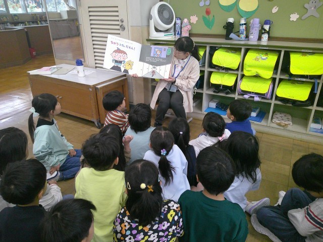 先生が本の読み聞かせをすると、興味深く聞く姿が見られました。