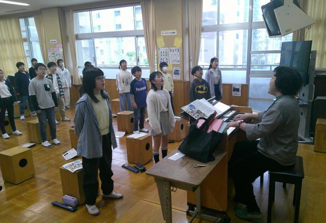 3階にある音楽室を覗きに行くと、6年生が良い姿勢で気持ちを込めて歌っていました。