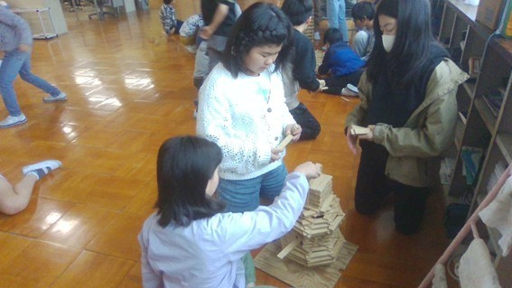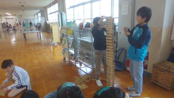 カプラをしている子どもたちは、一枚の木の板を友だちと工夫して積み上げていました。日頃からしているようで慣れていて、とても高いものができました。