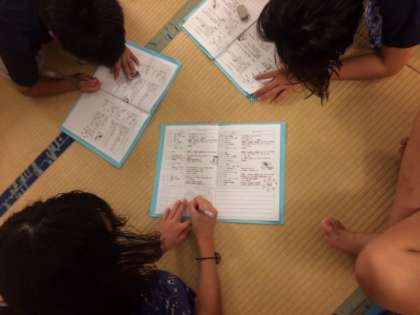 1日のまとめの反省会です。2日目の夜ということもあり、色々な反省点をみんなで話し合っています。頑張ったことや発見したことなど1日の頑張りがたくさん出てきています。
