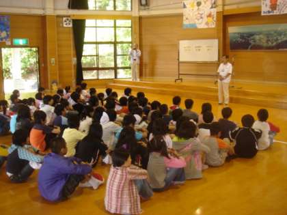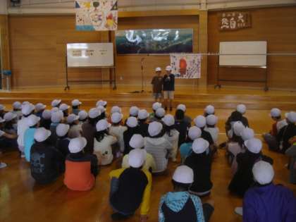 お世話になる「みさきの家」での入所式では,自分たちで作った旗をあげました。
