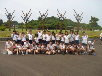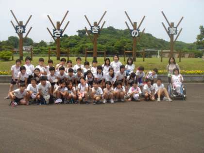 芝生広場の前で,学年ごとにみんなそろって,はい,ポーズ!