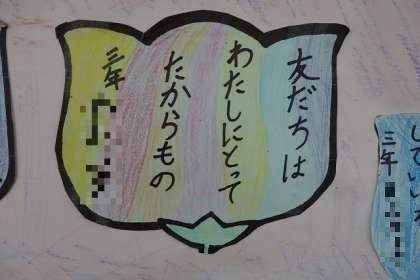 人権月間の取組の一つとして、各学級で人権標語を作りました。どの学級も友達や自分、家族に関する、心温まる標語を書いています。昇降口に掲示していますので、個人懇談会の時にぜひご覧ください。