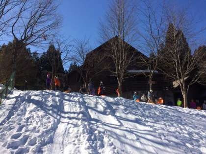 はじめの活動、『そりすべり』です。降雪量が比較的少なく、最適な雪質ではないようですが、上京区では見られない雪の量に驚きながらも、楽しくそりすべりをしています。