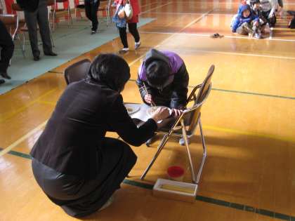 式典後のお楽しみでは,ざるを使ったみかん引きや大豆や落花生を箸を